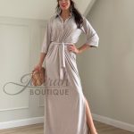 Although the dress is made from soft fabric, it features a structured collar inspired by classic men’s shirts, giving it a sharp and elegant look.